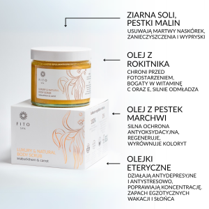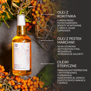 Olej z rokitnika i marchwi – intensywnie regeneruje skórę, przyspiesza odbudowę i wyrównuje koloryt.
